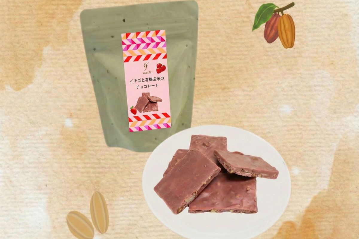 厳選された有機玄米を使用しており、濃厚なイチゴチョコとホワイトチョコレートの甘さと絶妙にマッチします。