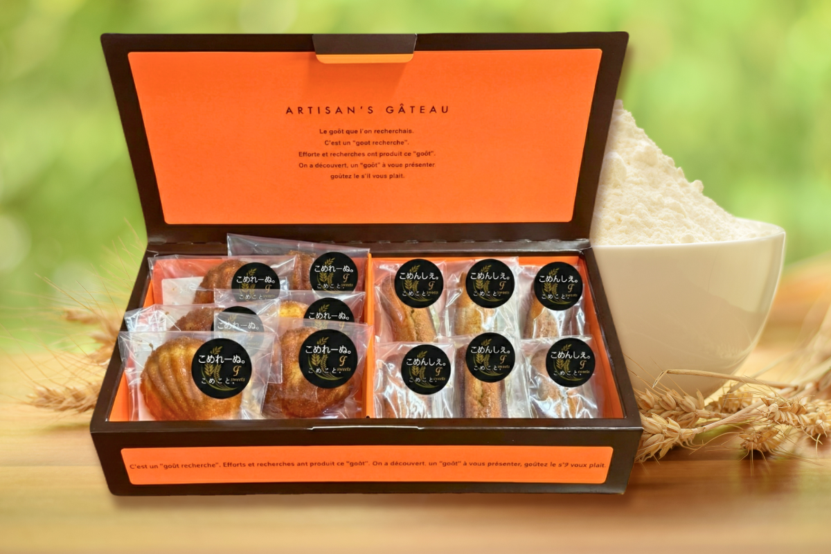 米粉のフィナンシェ「こめんしぇ。」と米粉のマドレーヌ「こめれーぬ。」をセットにしたギフトです。