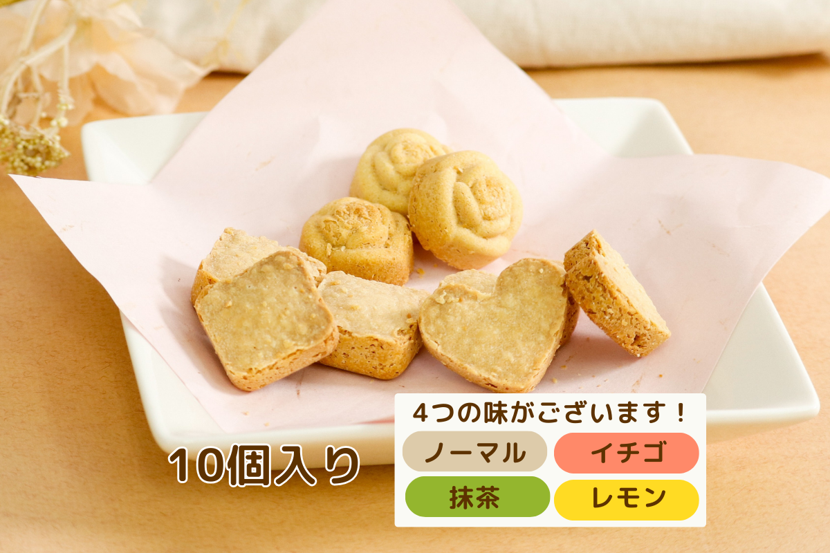 「見た目クッキーじつはチョコ」の4フレーバー(ノーマル、イチゴ、抹茶、レモン)を計10個詰め合わせた大容量パックです。